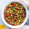 Ajoutez les tomates, les haricots noirs et rouges, le maïs, l'oignon rouge et les poivrons. Remuez le tout.