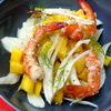 Lavez et essorez la mâche. Décortiquez les crevettes. Epluchez la mangue et coupez-la en une vingtaine de tranches. Coupez les tomates en deux. Dans un saladier mélangez sel, poivre, 1 cuil à café de curry, le jus du citron vert et 10 cl d’ l’huile d’olive.